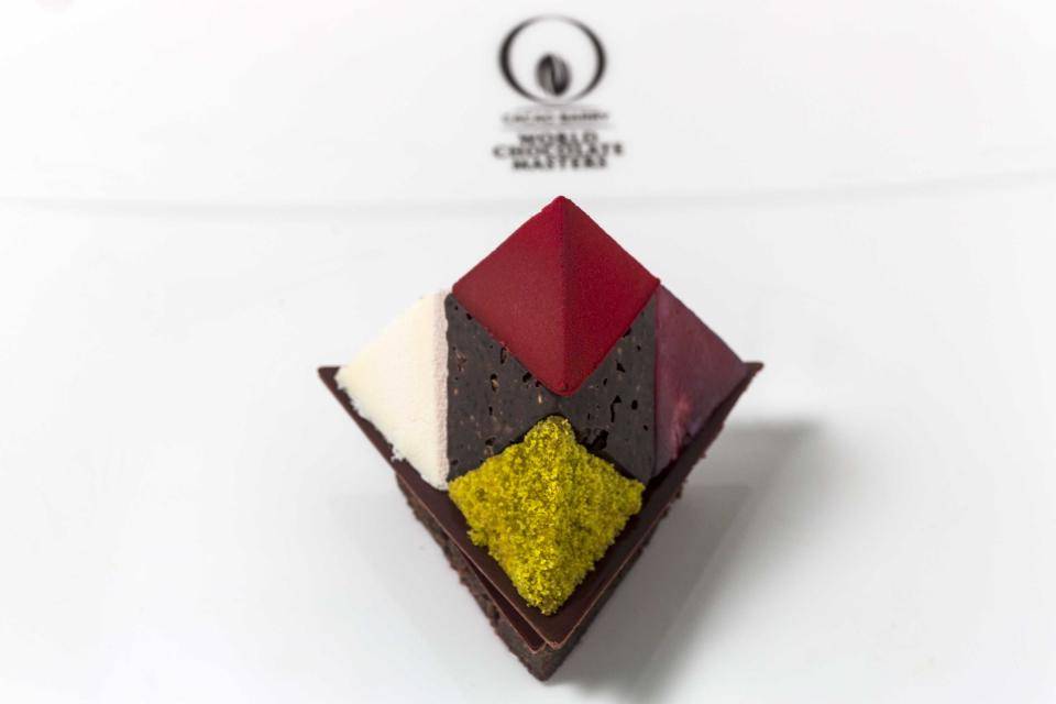 “Trigonopolis” - Chocolate sponge, ganache, lemon verbena sponge, sesame crunch, raspberry cremeux, raspberry gel, Kefir-namelaka