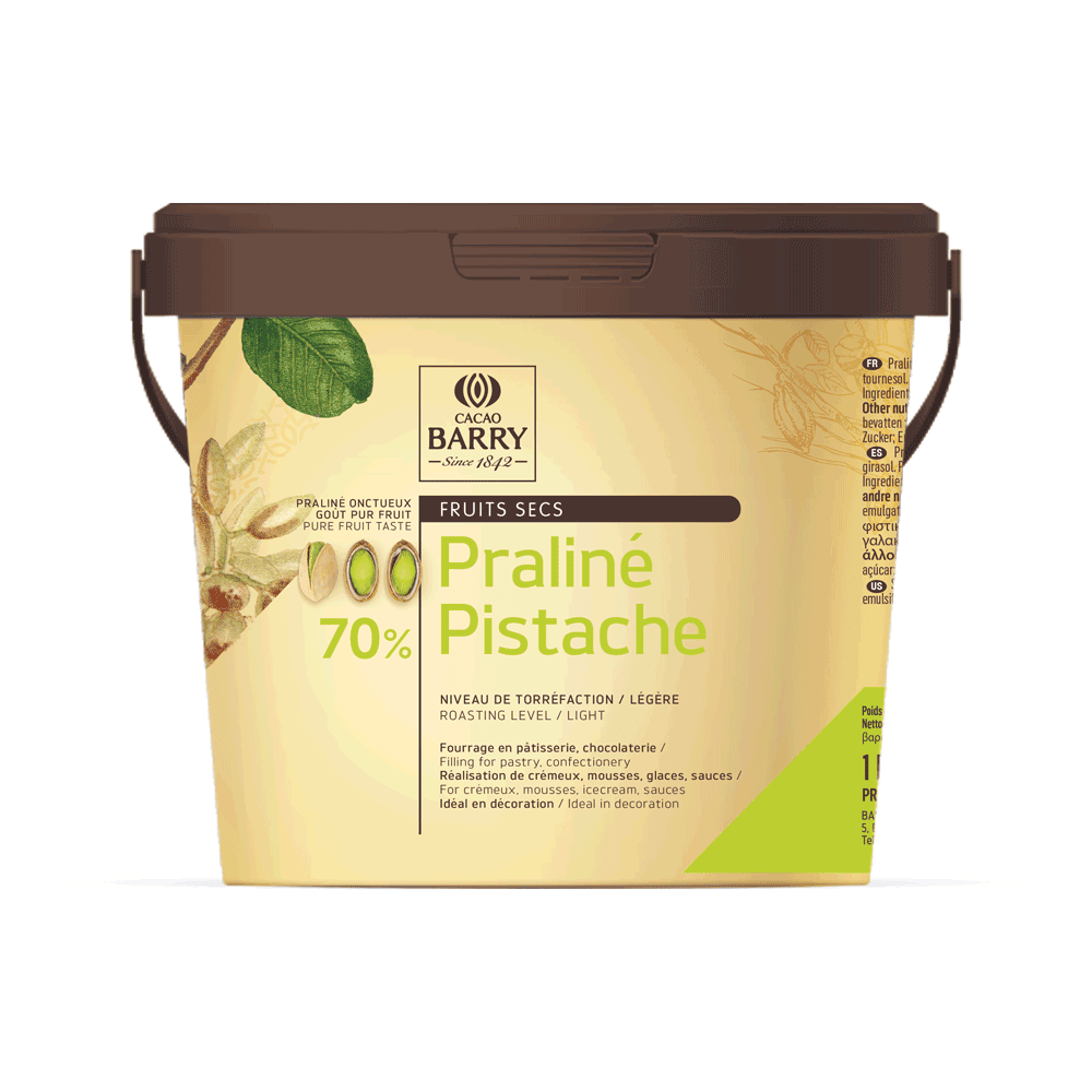 Praliné pasta 70% pistachos de Cacao Barry. De aspecto verde vibrante y perfil muy distintivo, se elabora con un 70% de pistacho (Pistacia vera) de origen mediterráneo, ligeramente tostado para conservar un sabor fresco y auténtico.